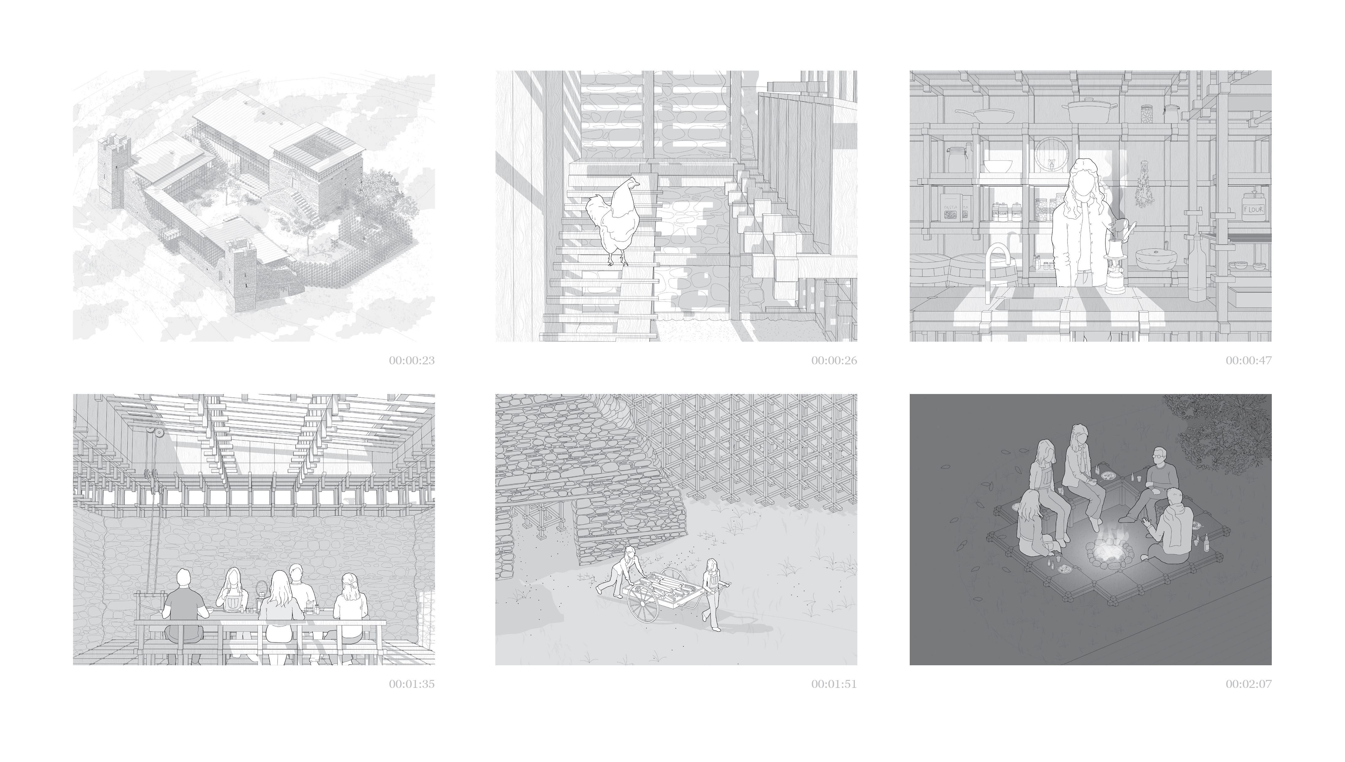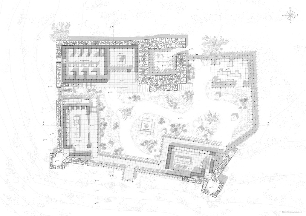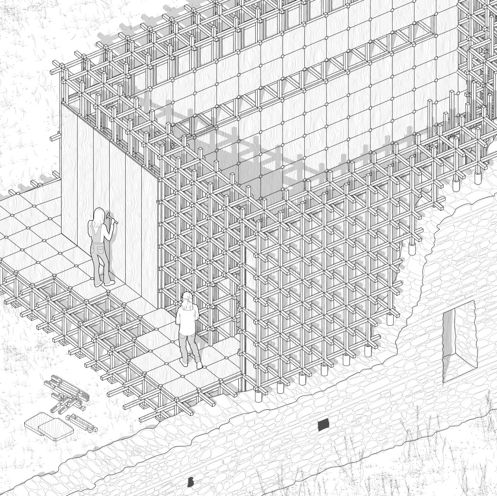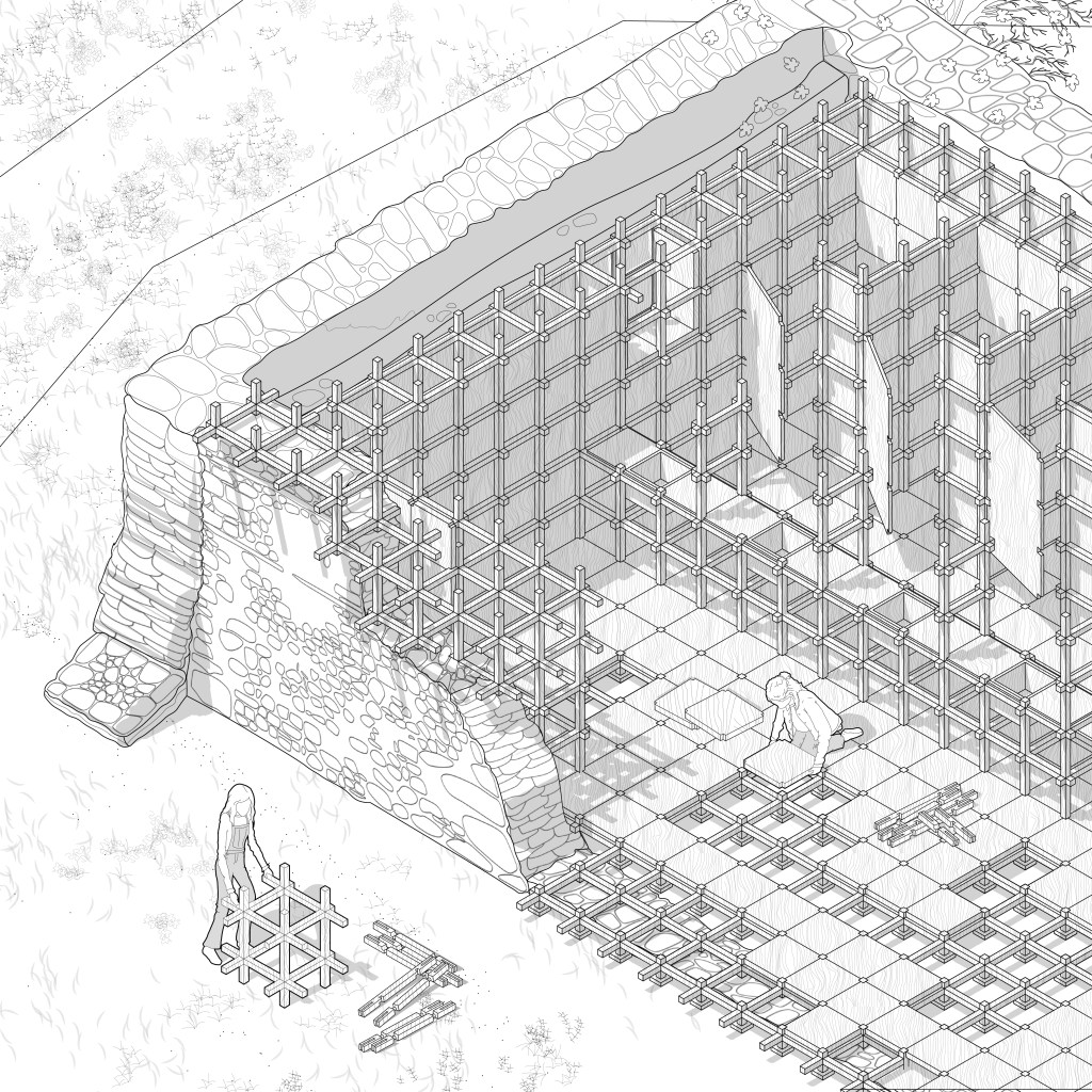 “METECHO” is an architectural narrative that takes place in an abandoned monastic property in the countryside of Epanomi. This abandoned fortress building was created in 1530 and its use implies its occupation by monks and farmers who cultivate and manage agricultural land owned by a monastery. This site is out of time and has been frozen in a dormant state, tending towards ‘disuse’. Abandonment, however, is not a static condition but rather advocates a transition between two different situations. The image of an unfinished and partially damaged building awakens the desire of two friends to reuse it and revitalize it, using the chidori, a wooden construction based on three elements that create a joint that does not require any screws. This dynamically developing system, comes to complement in a creative way the existing form and to create an architecture that promotes the commune in itself, promotes people to participate in its creation, to participate in its evolution and to participate in its functioning, thus participating in their association with each other. The narrative of this architectural story is ultimately about the revival of an abandoned building and the spirit of this place, through references to the history of this place and interpretations of the communal monastic ritual, whose dynamic evolution eventually prevents anything alive from becoming static.