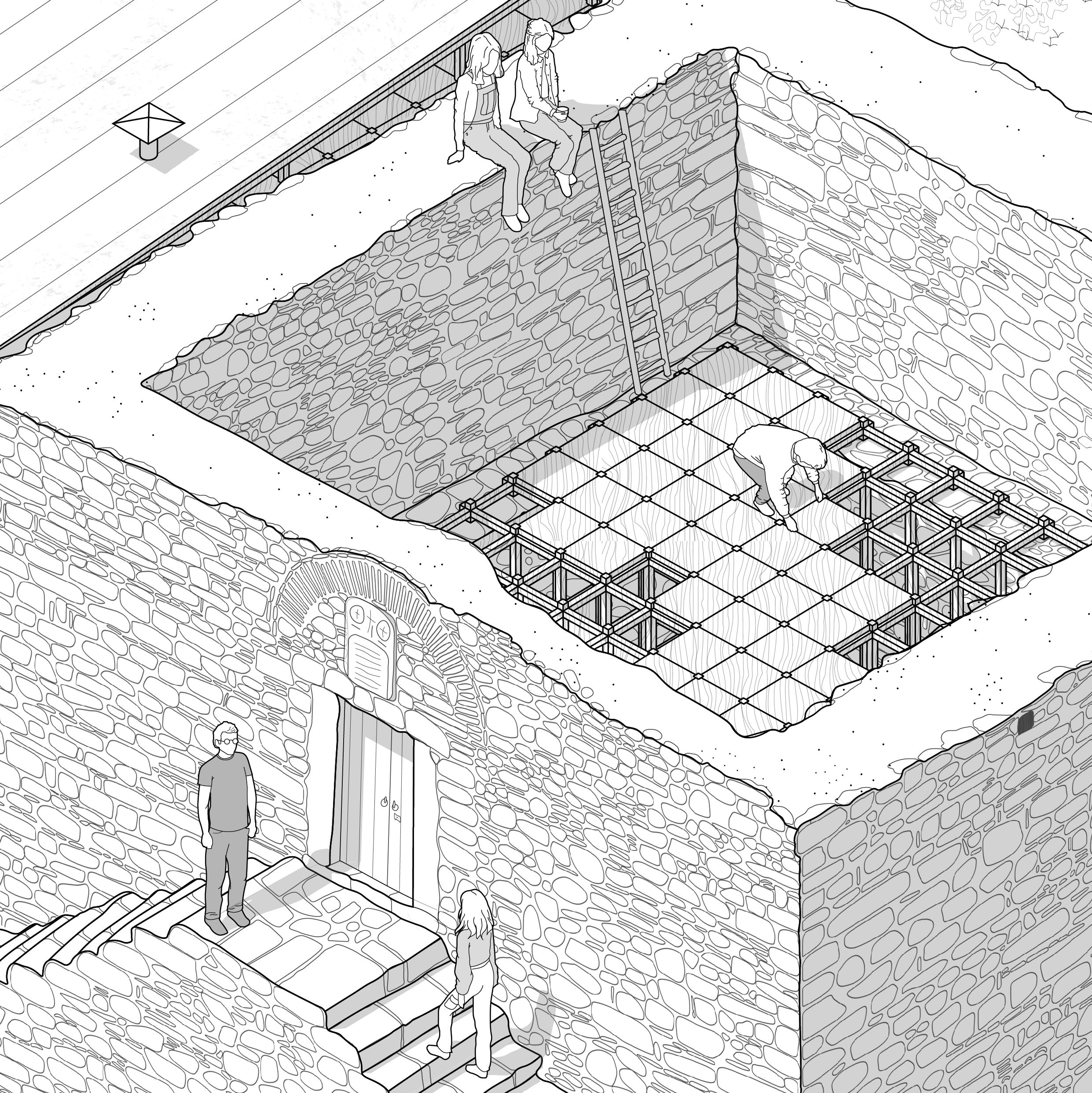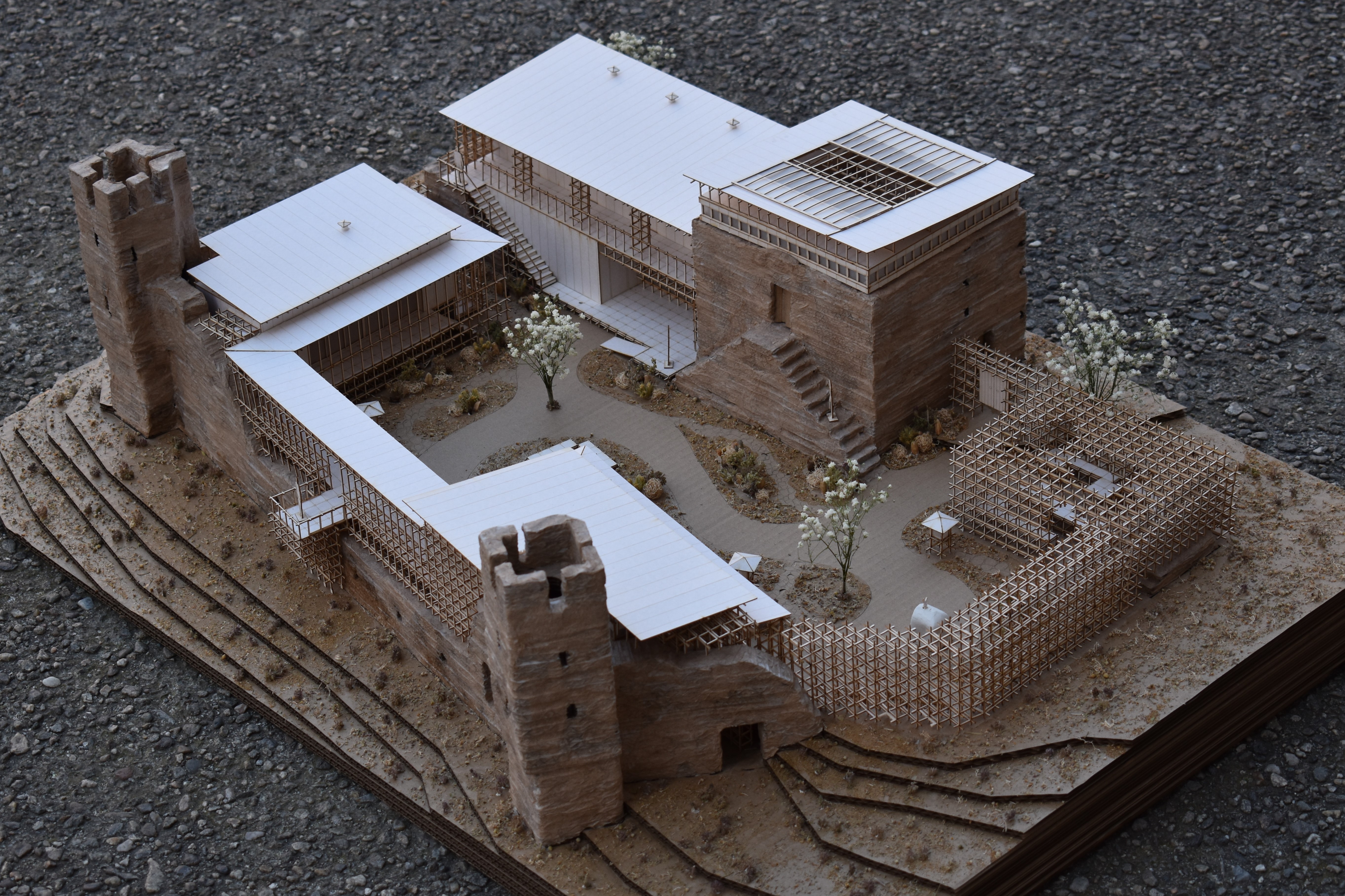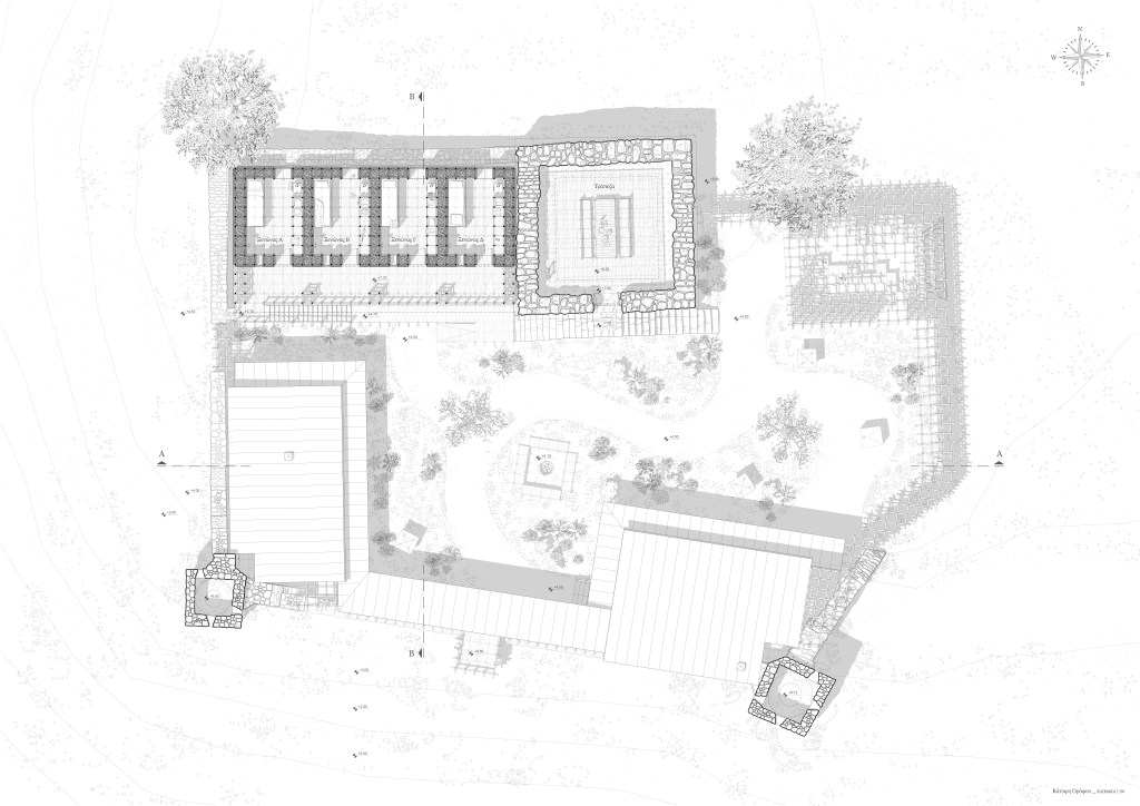 “METECHO” is an architectural narrative that takes place in an abandoned monastic property in the countryside of Epanomi. This abandoned fortress building was created in 1530 and its use implies its occupation by monks and farmers who cultivate and manage agricultural land owned by a monastery. This site is out of time and has been frozen in a dormant state, tending towards ‘disuse’. Abandonment, however, is not a static condition but rather advocates a transition between two different situations. The image of an unfinished and partially damaged building awakens the desire of two friends to reuse it and revitalize it, using the chidori, a wooden construction based on three elements that create a joint that does not require any screws. This dynamically developing system, comes to complement in a creative way the existing form and to create an architecture that promotes the commune in itself, promotes people to participate in its creation, to participate in its evolution and to participate in its functioning, thus participating in their association with each other. The narrative of this architectural story is ultimately about the revival of an abandoned building and the spirit of this place, through references to the history of this place and interpretations of the communal monastic ritual, whose dynamic evolution eventually prevents anything alive from becoming static.