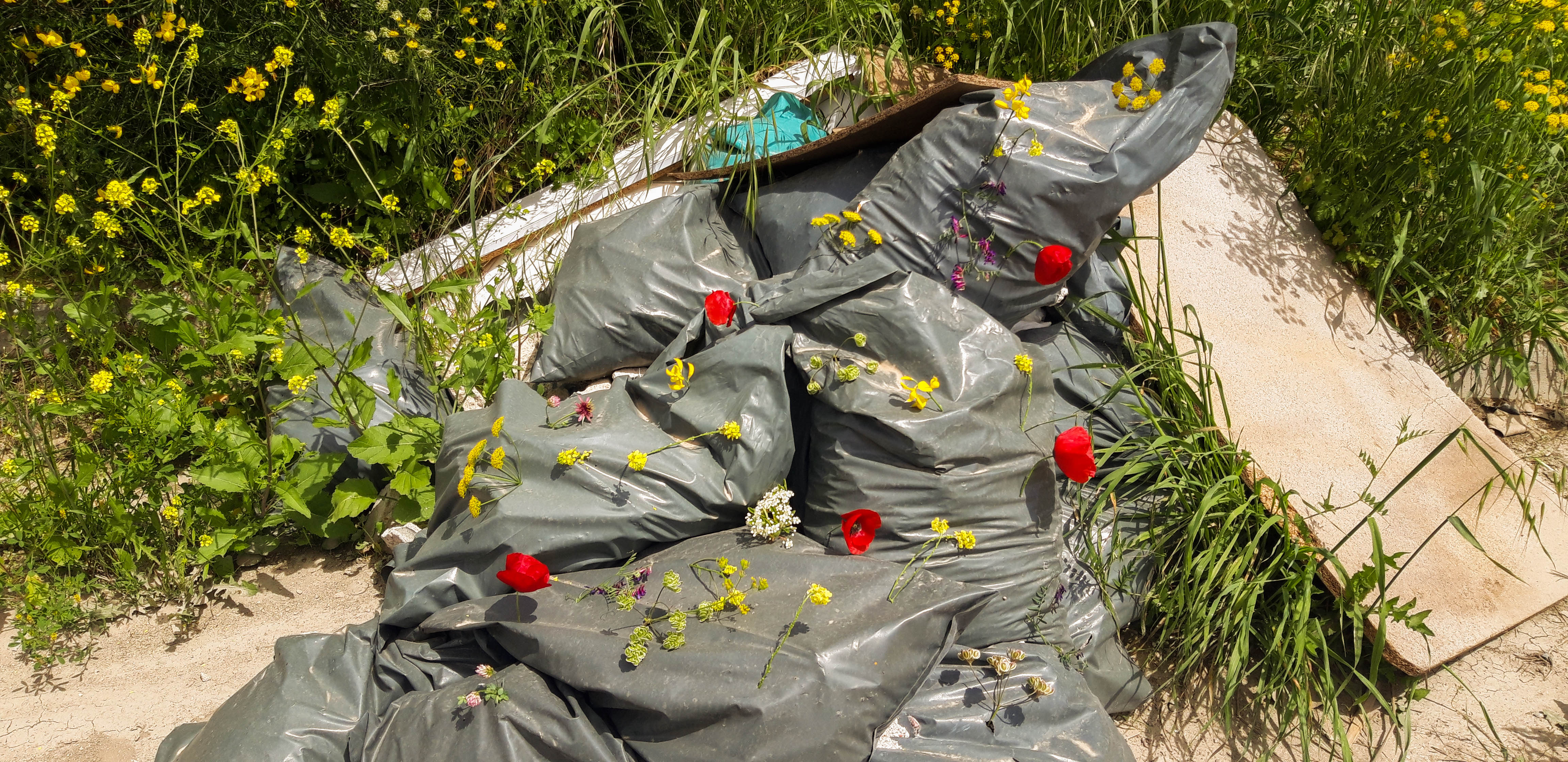 - The Field: Discarded trash bags, momentarily adorned with wildflowers, transforming neglect into a brief offering.
