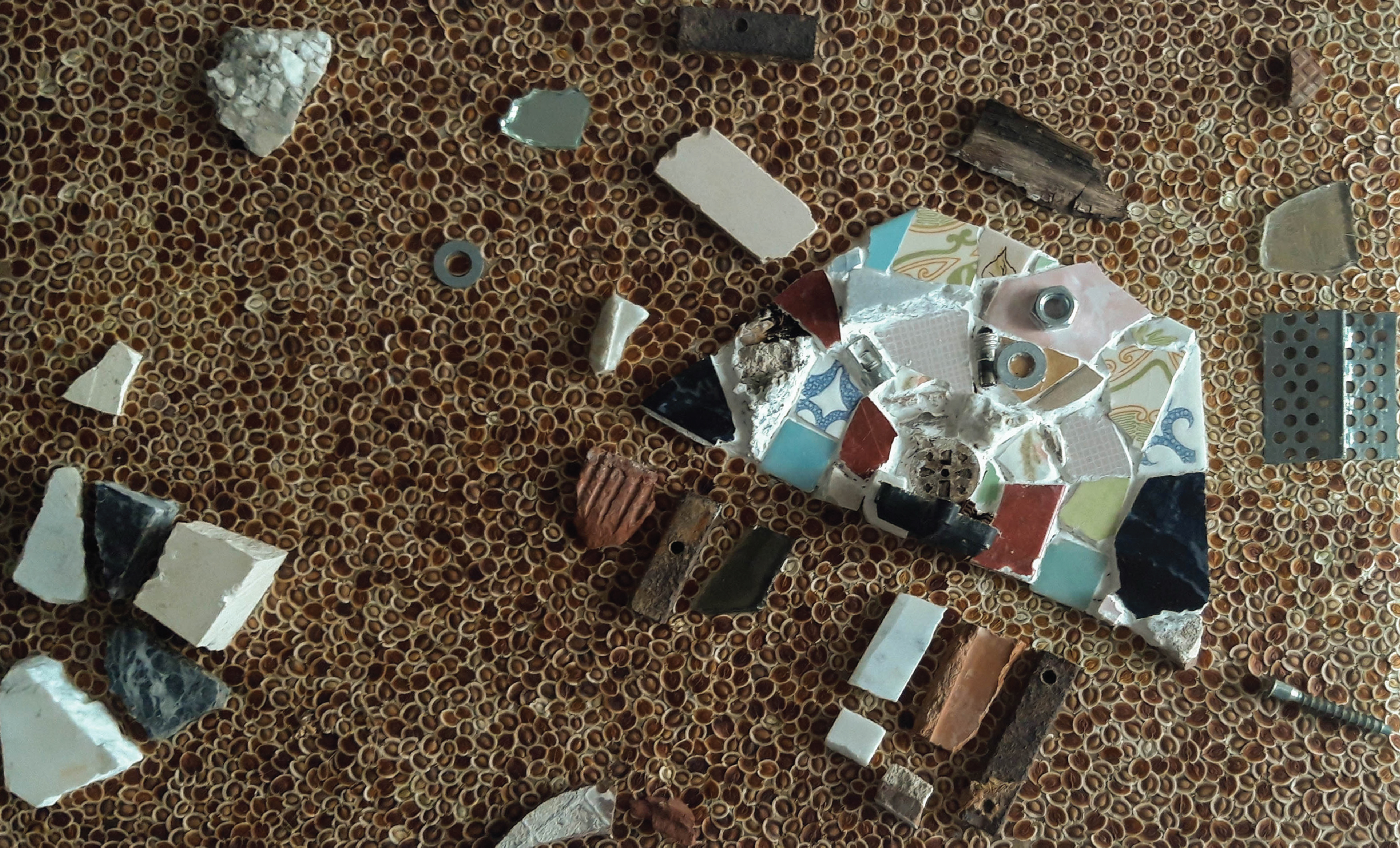 This silence is not empty; it is receptive. Here, discarded objects begin to speak. Marble scraps, rusted iron, a plastic bag lodged in the soil. Collected by hand, these fragments are reassembled into a quiet cartography: an abstract map of the area traced with its own found materials.
